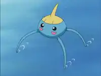 When Team Rocket saw Surskit, they figured that it would be a good present for their Boss and decided to capture it. As they were about to capture it, Skitty ruined Jessie's hair, thus, allowing it to escape. Jessie's rage fueled Team Rocket next attempt, and Surskit was up against Seviper and James's Cacnea. It destroyed a nearby rock wall with a Water Pulse, flooding the area and damaging Team Rocket's plot. Jessie resorted to trying to wrestle Surskit out of Max's hands, but May's Skitty Double Slapped her in the face before Ash's Pikachu sent Team Rocket blasting off. Afterwards, Max declared that he intended to train Surskit hard, and one day become a formidable team. Surskit's known moves are Agility, Water Pulse, and Bubble Beam. | ||