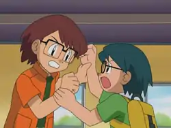 Later, May and Max followed after a wild Surskit directly to the brown-haired Max's location. Another fight started, though Brock and the others called out their Pokémon as a distraction tactic. The two Max began to bond over their common love for Pokémon. Blue-haired Max then said he got to see them every day, and that his father is a Gym Leader, making the other Max impressed.