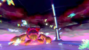 Multicolored sparkles of light appear around Gigantamax Centiskorch's upper body and form into light green orbs of energy. The orbs then burst, releasing blasts of light green energy and multicolored butterfly-shaped masses of energy at the opponent. | ||