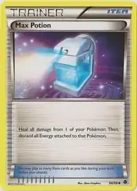 Max Potion was introduced as an Item card in the Pokémon Trading Card Game during the English Black & White Series (the Japanese BW Era) in the Emerging Powers expansion with artwork by 5ban Graphics.