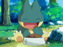 True to its species, Munchlax loves to eat. Its love for food is so great that it has no qualms about eating others' food whether it belongs to people or Pokémon. Another known trait is that Munchlax's hunger will usually distract it when May is attempting to catch a Pokémon, such as in Rough, Tough Jigglypuff, when May attempted to catch a Jigglypuff; and On Cloud Arcanine, when she wanted to add a wild Arcanine to her team. However, its love for food was proven to be helpful at times, such as in Spontaneous Combusken!, in which it instantly woke up for May's food after using Rest as a result of Metronome during the Appeals Round of the Chrysanthemum Contest.