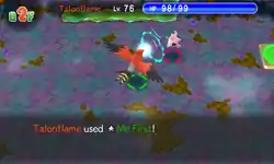 In Explorers of Time, Darkness and Sky, Me First is a move with 22PP that ignores accuracy and evasion checks. The user targets an enemy in front, and uses a random damaging move that the enemy knows; the move will fail if the target has none. The damage of the called move is boosted by 50%. This move is affected by Taunt.