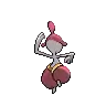 Medicham is a humanoid, bipedal Pokémon that resembles a yoga practitioner. It has a gray body with red and yellow adornments. A red headpiece with three bulb-like extensions covers the upper portion of its head: one on top and one on either side. The bulb on top is short on a female Medicham. Its large, focused eyes are slightly covered by the headpiece, and its red lips seem to be in a rounded or puckered position. Its legs appear to be covered with puffy, red pants that have a large yellow spot on the knees and yellow bands next to the hips.