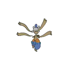 As Mega Medicham, its headpiece now resembles a white turban with a yellow stone in the center. The red extension in the back is retained, and there are five white extensions on the turban, three extending from the stone and one on either side of its head. There is now a gold band on each wrist and additional gold bands around its waist. Several blue, teardrop-shaped decorations hang from the lowest hip band. Using its enhanced willpower, Mega Medicham has formed four ghost-like arms around itself. The more trained its spirit, the more realistic and dexterous its self-created arms become.[1]