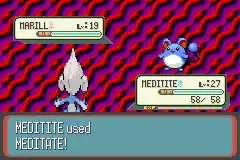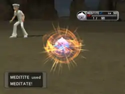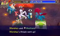 In Red Rescue Team, Blue Rescue Team, Explorers of Time, Explorers of Darkness and Explorers of Sky, Meditate is a move with 22PP. The user raises its Attack by one stage. This move is affected by Snatch and Taunt.