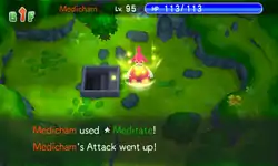 | Medicham floats into the air and meditates. Sometimes it gets outlined in a blue aura and can control nearby objects. | |||
