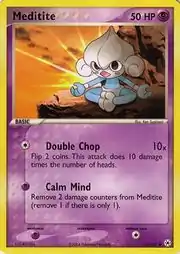 Meditite (Japanese: アサナン Asanan) is a Psychic-type Basic Pokémon card. It is part of the EX Hidden Legends expansion.
