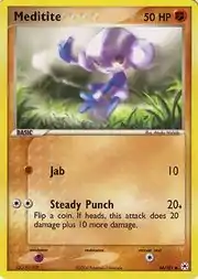 Meditite (Japanese: アサナン Asanan) is a Fighting-type Basic Pokémon card. It is part of the EX Hidden Legends expansion.