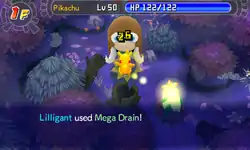 In Red Rescue Team and Blue Rescue Team, and Explorers of Time, Darkness and Sky, Mega Drain is a move with 8 base power, 88% accuracy, and 17 PP. The user attacks enemy in the front, and up to 50% of the damage dealt to the target is restored to the user as HP, including excess damage.