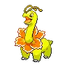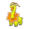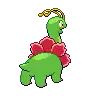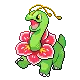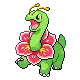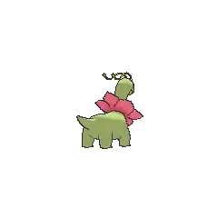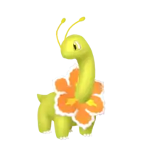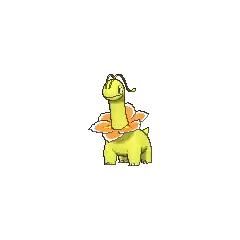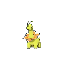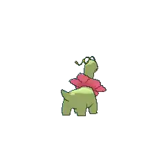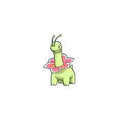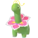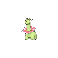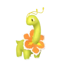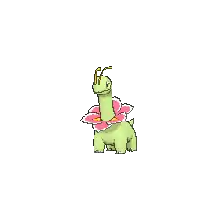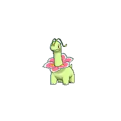 Meganium is a quadrupedal, pale-green Pokémon that resembles a sauropod dinosaur. It has a long neck; yellow eyes; a short, blunt snout; and two stamen-like antennae on top of its snout. The antennae are shorter on a female than on a male. Encircling Meganium's neck are large, pink flower petals with a yellow central pattern and white edges. It has three claws on each foot and a stubby tail.