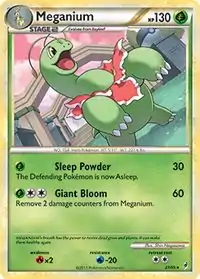 Meganium (Japanese: メガニウム Meganium) is a Grass-type Stage 2 Pokémon card. It was first released as part of the HeartGold & SoulSilver expansion.