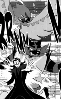 | Incineroar is the most powerful of Meja's Pokémon, initially he battles Akira's Lycanroc. It emulates much of his Trainer's violent attitude, including attacking Akira during the battle.