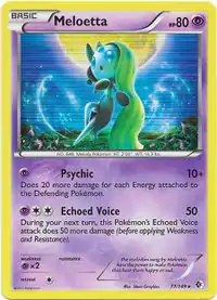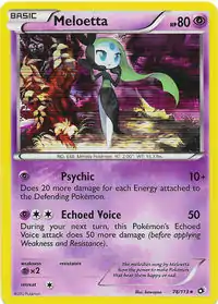 This card features the Aria Forme of Meloetta. Psychic and Echoed Voice are both moves in the Pokémon games that Meloetta can learn. This card's Pokédex entry comes from Pokémon Black 2 and White 2.