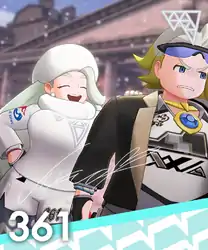 In PASS18, Melony met Henry Sword, Casey Shield, and Marvin in Circhester. She asked Henry to repair an ice cane belonging to her Mr. Rime. Once the cane was fixed, Melony recalled how she caught Mr. Rime, revealing that she was responsible for the cane breaking in the first place. When Henry admitted he hadn't fully completed the repairs, Melony suggested he keep Mr. Rime, noting that it preferred Henry's company more. Afterward, Melony faced Henry and Hop in Gym battles, which she lost.