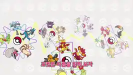 The title of the song is shown. The waveform of the song appears in the background with many Poké Balls. Pokémon appear in a line, moving right-to-left as they are named, while a Poké Ball flashes in the color of the Pokémon in the background. The chain ends in failure and a jingle plays. The background Poké Balls flip to briefly show silhouettes of various Pokémon and other Poké Balls change in size to the beat. Another line of Pokémon is shown and ends successfully. Five wheels each with five Pokémon move and rotate. After that, the title of the song is shown again at the end.