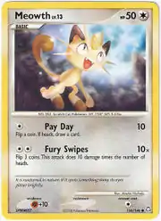 Pay Day and Fury Swipes are both moves in the Pokémon games that Meowth can learn. Pay Day's Japanese name uses the Hiragana ねこ rather than the Katakana ネコ used in the video games. This card's Pokédex entry comes from Pokémon Diamond and Pearl.