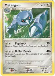 Psyshock's Japanese name is that of Confusion, a move in the Pokémon games that Metang can learn. Bullet Punch is also a move that Metang can learn. This card's Pokédex entry comes from Pokémon Diamond and Pearl.