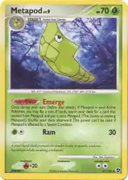 Metapod (Japanese: トランセル Transel) is a Grass-type Stage 1 Pokémon card. It is part of the Great Encounters expansion.