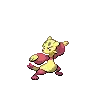 Mienfoo is a yellow, bipedal, mustelid-like Pokémon, with round ears, red eyes, and a pink nose with a whisker on each side. Its red arms look similar to flared sleeves, and the paws are yellow. Mienfoo's chest has a small red band, and its pelt piles around its thighs resembling a tunic or robe. Its legs are red, and its yellow tail is also tipped red.