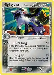 Mightyena δ (Japanese: グラエナ δ Graena δ) is a dual-type Darkness/Metal Stage 1 Pokémon card. It is part of the EX Delta Species expansion.