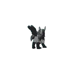 Mightyena is a quadrupedal Pokémon that is based on a hyena. Its fur is mostly short and gray, but there is shaggy black fur on its lower legs, tail, and in two thick strips starting behind its eyes and running the length of its body. It has dark, triangular streak patterns below its eyes, which are red with yellow sclerae. Its ears are rhombus-shaped with dark insides, its nose is red, and it has gray paw pads.