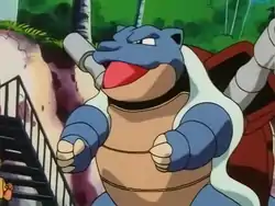| Cissy chose Blastoise to use in the Pokémon Wave Ride portion of Ash's Gym match with her. It was temporarily captured by Team Rocket but it escaped from them easily by using its overwhelming strength, and sent the trio blasting off with its powerful Hydro Pump. Blastoise was set against Ash's Lapras for the Wave Ride. What Lapras had over it in speed, Blastoise matched with strength. Cissy's strategy was to have Blastoise ram Lapras from the side in order to knock Ash off and give her a clear lead. As Cissy and Blastoise were nearing the finish line, a tidal wave came upon them. While Ash was saved by Lapras's Ice Beam, Cissy was knocked off Blastoise when the wave hit. Blastoise moved quickly and saved Cissy from falling in the water. Even though they caught up with Ash and Lapras, Ash still managed to cross the finish line first by having Lapras use Ice Beam and riding on the ice.