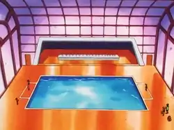 The interior of the Gym is built for a Pokémon water battle, much like the ones in Cerulean City, Sootopolis City, and Pastoria City. However, it is also used to ensure that all Water Pokémon have an equal standing while they compete in the Water Gun match-up, where a Pokémon's accuracy and speed is tested. The Pokémon who shoots down the most targets wins.
