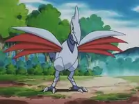 | Miki has a very strong Skarmory which she uses to battle Fire-type Pokémon in order to help it master its type disadvantages. After Skarmory defeated Brock's Vulpix with its Steel Wing, Ash sent out his Cyndaquil to battle Skarmory. Skarmory used Fury Attack and Swift in the battle, nearly knocking Cyndaquil out. Skarmory was about to finish off the Fire-type when the two Pokémon were captured by Team Rocket. It broke free easily with Swift and later sent Team Rocket blasting off, freeing Cyndaquil in the process.