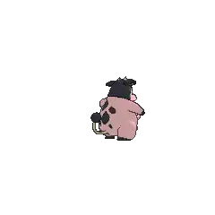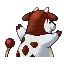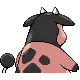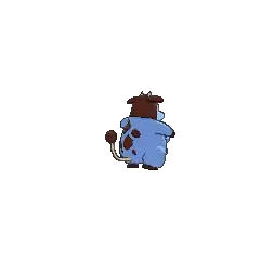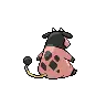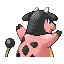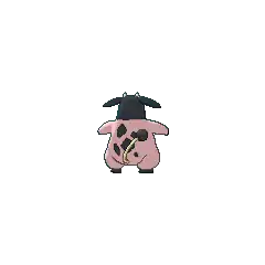 Miltank is a bipedal, bovine Pokémon, which can only be female. Its body is mostly pink, with a yellow belly and black, angular markings along its back. A black hood-like marking surrounds its face with a pink, triangular mark on its forehead. There are two small horns on top of its head. It has large, blue eyes, a black nose, and a wide mouth, as well as long, black, floppy ears with yellow insides. Miltank has a yellow udder with four pink teats. All four of its limbs end in black, cloven hooves, and its long tail is tipped with a black sphere. In The Young Flame Strikes Back!, a smaller Miltank was shown without any horns or teats, implying that this is what young Miltank look like.
