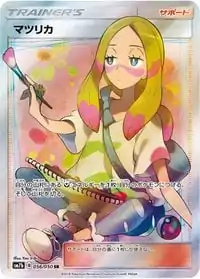 Mina was introduced as a Supporter card in the Pokémon Trading Card Game during the English Sun & Moon Series (the Japanese SM Era). It was first released in the Japanese Fairy Rise expansion before debuting in English in the Lost Thunder expansion, with the background artwork by Ken Sugimori. It was also released as a Full Art card in Fairy Rise and Lost Thunder, with an illustration by You Iribi. It allows the player to search their deck for a ![]()