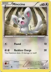Minccino (Japanese: チラーミィ Chillarmy) is a Colorless-type Basic Pokémon card. It is part of the Dragons Exalted expansion.