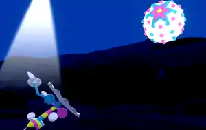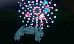 Blacephalon grabs its head and tosses it in the air. It then starts to glow and explodes in midair into something resembling fireworks. | ||