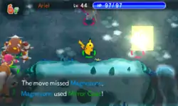 When Suicune gets hit by a special attack, it forms multiple ice mirrors around the opponent. The mirrors causes the opponent to see illusions, and when they touch the mirrors, they shatter and the opponent gets hurt by the same amount of damage that Suicune took, but several times stronger, or Suicune creates an ice mirror in front of it that repels special attacks. | ||