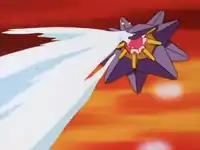 In The Water Flowers of Cerulean City, Starmie was used in Misty's Cerulean Gym match against Ash. Misty had successfully beaten Butterfree with Staryu, and Starmie was called out against Pidgeotto, suggesting that, at this time, Starmie was more powerful than Staryu. It dived underwater to dodge Pidgeotto's Whirlwind and shot up into the air to land a Tackle. However, its second Tackle was deflected by Wing Attack. It was blown into a Gym wall by a Gust attack, on the brink of losing before Team Rocket intervened. The battle was called off and Ash was given the Cascade Badge regardless.