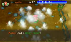 Misty Terrain (Japanese: ミストフィールド Mist Field) is a non-damaging Fairy-type move introduced in Generation VI. It is TM89 in Pokémon Sword and Shield.