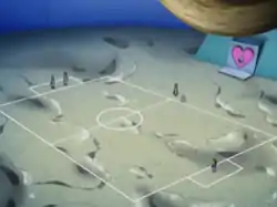 The Gym's battlefield has multiple planet-like objects floating around in the air, making it three-dimensional. The battles are refereed by Tate and Liza's mother, Rachel.