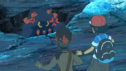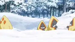 In Not Caving Under Pressure!, Ash and his classmates, on their way back from Hokulani Observatory, took a shortcut through caves that ran under Mount Hokulani and Mount Lanakila. However, they were separated after a clash between Kiawe's Marowak and Turtonator caused an explosion. On their way to rejoin their friends, Lillie, Mallow, and Sophocles ran into a small group of wild Alolan Sandshrew, led by a larger Sandshrew, which were being driven from their territory by a wild Tyranitar. After being caught in the middle of battle, Lillie and Snowy teamed up with the leader Sandshrew and were able to drive off the Tyranitar. In the process of repairing the cave, Sophocles's Charjabug found an Ice Stone, which the leader Sandshrew used to evolve into Sandslash. This caused the group to realize that the cave was in fact an Ice Stone mine where Sandshrew come to evolve, as well as to wonder if the large Sandslash was in fact a Totem Pokémon. The grateful Sandslash then gave Lillie an Icium Z.