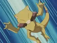 It teleported onto Ash's arms while he and his friends toured Len Town with Cherry. Mrs. Bellows was angry that her Pokémon did so. After that, Abra kept teleporting itself onto other people's heads. Later, it teleported itself into a tree and was confronted by Team Rocket's giant Gengar robot. It defended itself, but was captured after its attack was deflected by the robot. It was later freed when Ash's Pikachu destroyed the cage holding Abra and the other stolen Pokémon. | ||