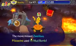 In Explorers of Time, Darkness and Sky, Mud Bomb is a move with 12 base power, 88% accuracy, and 10PP. The user attacks enemy in the front, cutting corners, possibly lowering their accuracy by one level.