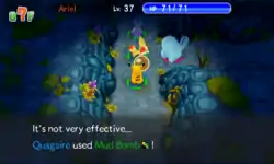 Gastrodon releases a powerful ring of mud from underneath it at the opponent. The mud then covers the opponent, causing it to be trapped underneath it, or Gastrodon opens its mouth and fires multiple balls of mud from it at the opponent. | ||