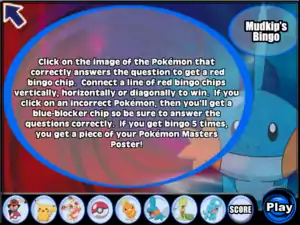 Click on the image of the Pokémon that correctly answers the question to get a red bingo chip. Connect a line of red bingo chips vertically, horizontally, or diagonally to win. If you click on an incorrect Pokémon, then you'll get a blue-blocker chip so be sure to answer the questions correctly. If you get bingo 5 times, you get a piece of your Pokémon Masters Poster!