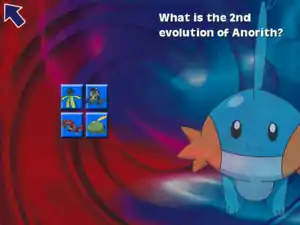 The questions are numbered from 1 to 51 in the internal files, although the question number is not seen in the game itself, and the questions are asked in a random order. In these questions, "2nd evolution" and "3rd evolution" refer to the second and third stages, respectively. All the answers are Pokémon species up to the Generation III.