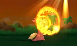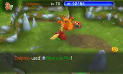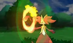 | Delphox swings its wand stick around in a circle, forming a ring of red-orange fire in front of itself. It then releases a red-orange stream of fire from its mouth at the opponent. | |||