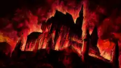 N's Castle was first seen in a flashback in The Name's N!. When Ash told N how he and his friends were trying to find Reshiram, N had a flashback of his youth, a moment when he had been at his castle, which, along with its surroundings, had been on fire. He saw Reshiram appearing before him, and kept looking at it as it flew away.