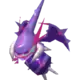 Naganadel is an Ultra Beast that has both draconic and insectoid features. Its upper body is slender with thin arms and a long neck. The upper chest, neck, head, and arms are light purple, while its waist is dark purple with a fuchsia stripe on each side. Each shoulder has a long gray spike and each hand has three pinkish-purple claws. Running down each side of its neck is a dark purple stripe, which connects and forms a loop on its chest. The lower area of the loop is fuchsia and has a short, downward extension in the middle. At the end of its long neck is its head, which has a long, spiked crest on the top. On the sides of its mouth are a pair of curved, gray spikes that act as mandibles. Its glowing cyan eyes are conjoined, rimmed with fuchsia, and have a spiky crest on either side, which gives them a visor-like appearance. A pair of light purple wings sprout from the center of its back. These wings have a single fuchsia claw at the joint, two spikes along the wing-arm and darker purple membranes with fuchsia markings near the spikes.