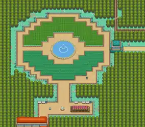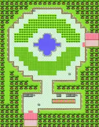 The northern part is circular and resembles a Poké Ball, with a fountain in the center, a semi-circular patch of tall grass to the south and another of long grass to the north, the first instance of this type of grass that is encountered in the games. Trainers can be battled only within these patches of grass, though there are no Trainers to battle during a Bug-Catching Contest.