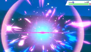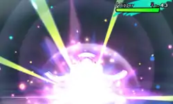 Tapu Koko slams one of its hands on the ground and a pink shockwave comes out of the ground, with wisps of blue aura appearing above the ground, pushing the target back. When the target falls to the ground, it is hit with multiple pink, blue, and yellow bolts. | ||