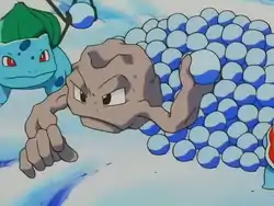 | Geodude was only seen during the race down the mountain. Besides using its weight to help steer the sled, Geodude also had a powerful throw in the snowball fight to defend against Team Rocket.