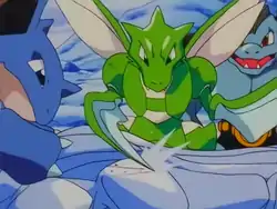 | Scyther was the only one of Danny's Pokémon to be in both the second and third challenges. It first helped carve the block ice into a sled after which it then helped steer that sled in the race down the mountain.