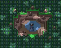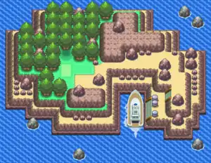 Newmoon Island is a mostly rocky island housing a small grove. The grove contains a puddle in the shape of a circle, with darker-than-usual water, representing the new moon. No wild Pokémon other than Darkrai reside on the island.
